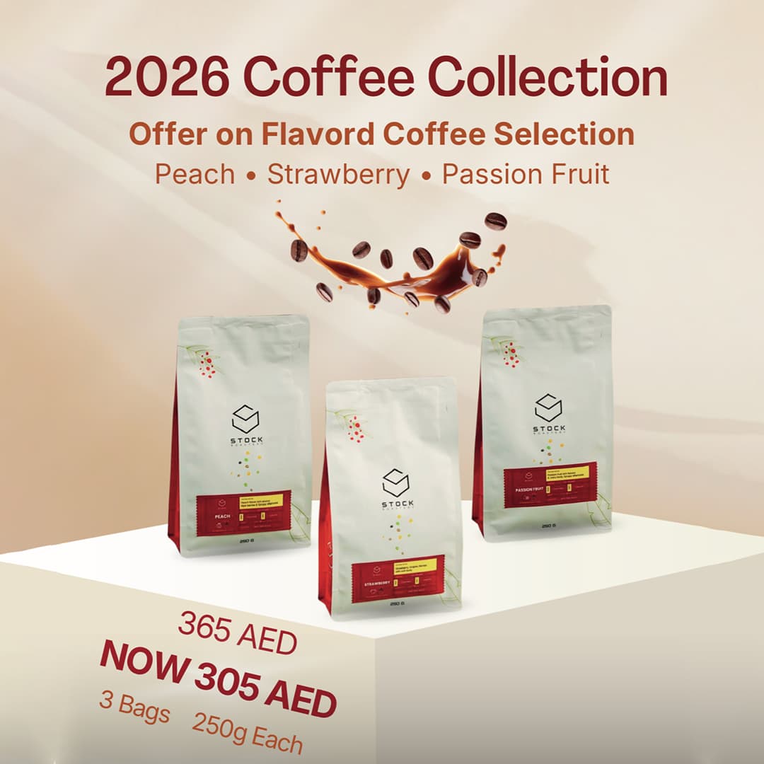 Discover the 2026 Coffee Collection with a special price on our Flavored Coffee selection. Peach, Strawberry, and Passion Fruit flavors. 3 bags, 250 g each, now for 305 AED. Limited time.