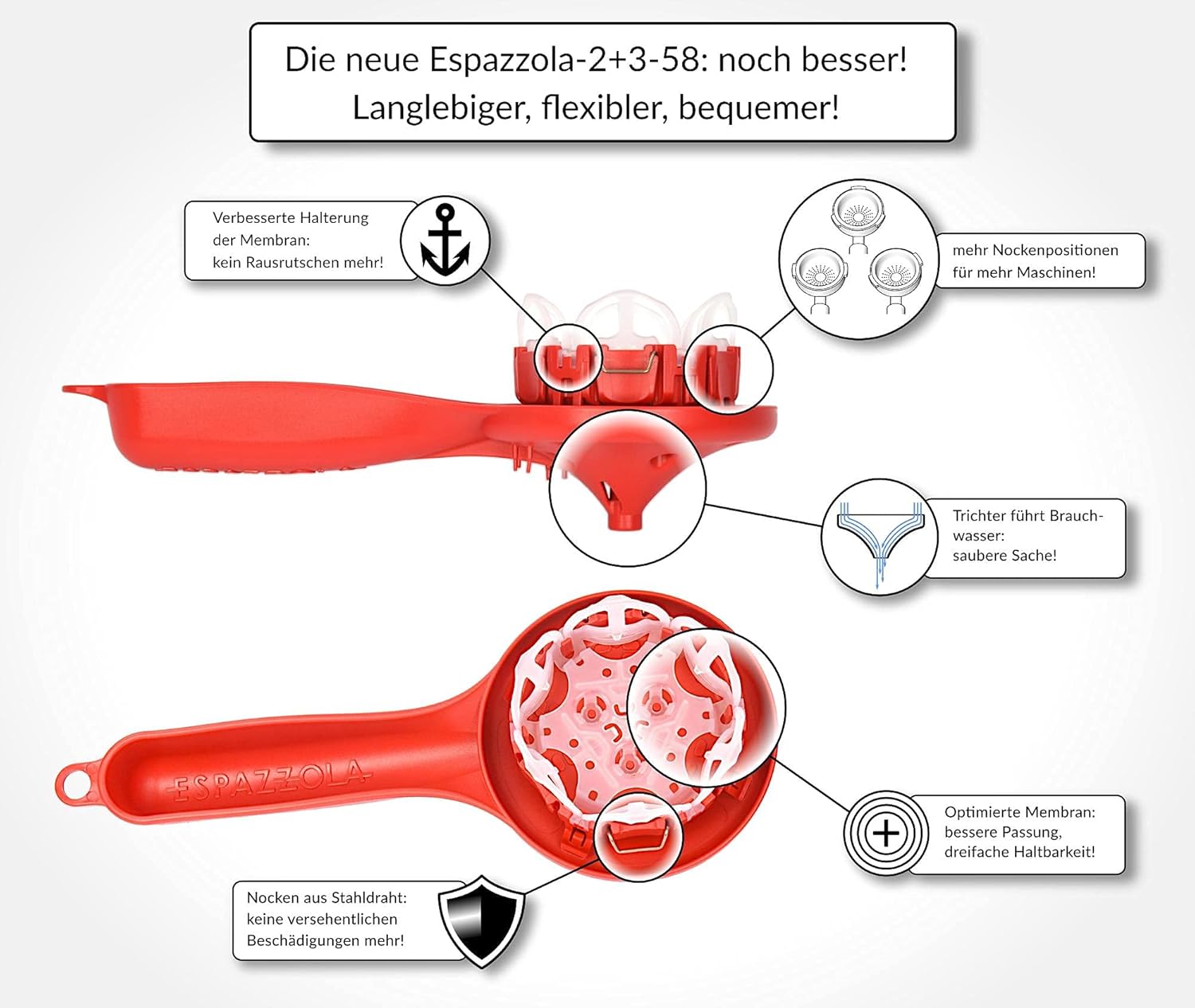 The Espazzola consists of a rigid cup section that can be inserted into the group-head like a portafilter. A flexible insert - the membrane - is mounted into the cup.